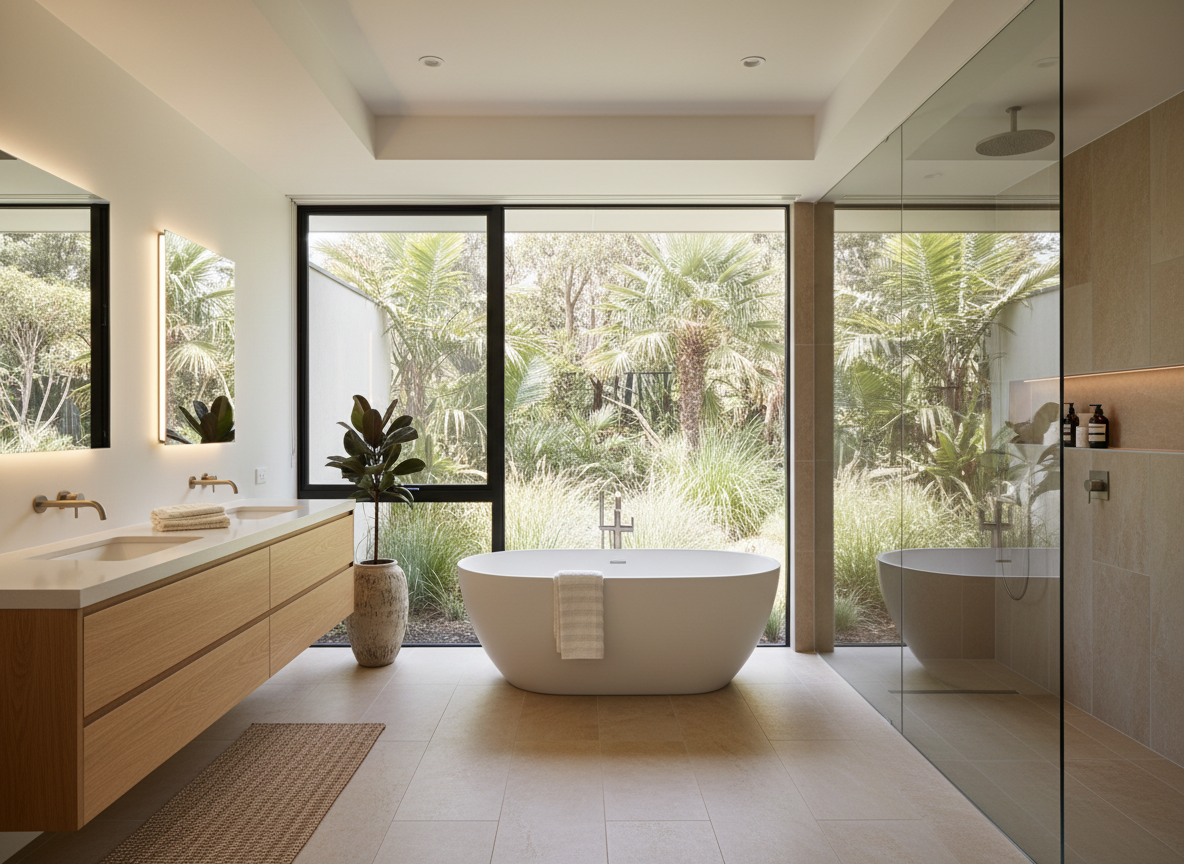 A floating timber vanity introduces warmth and organic texture, complemented by minimalist fixtures and clean architectural lines. Neutral stone flooring and a frameless glass shower enclosure enhance the sense of openness, while carefully placed greenery reinforces the calming, resort-like atmosphere.